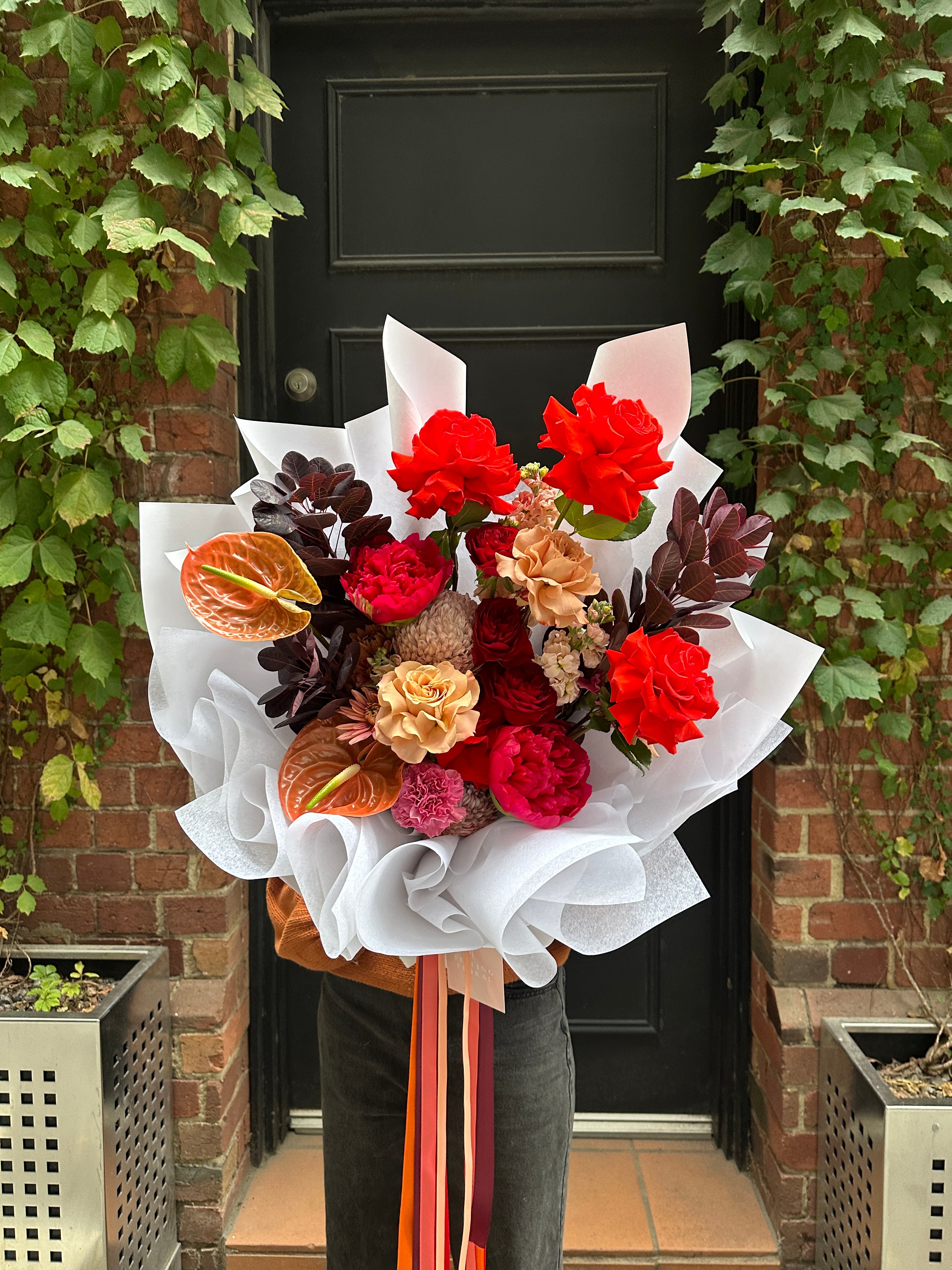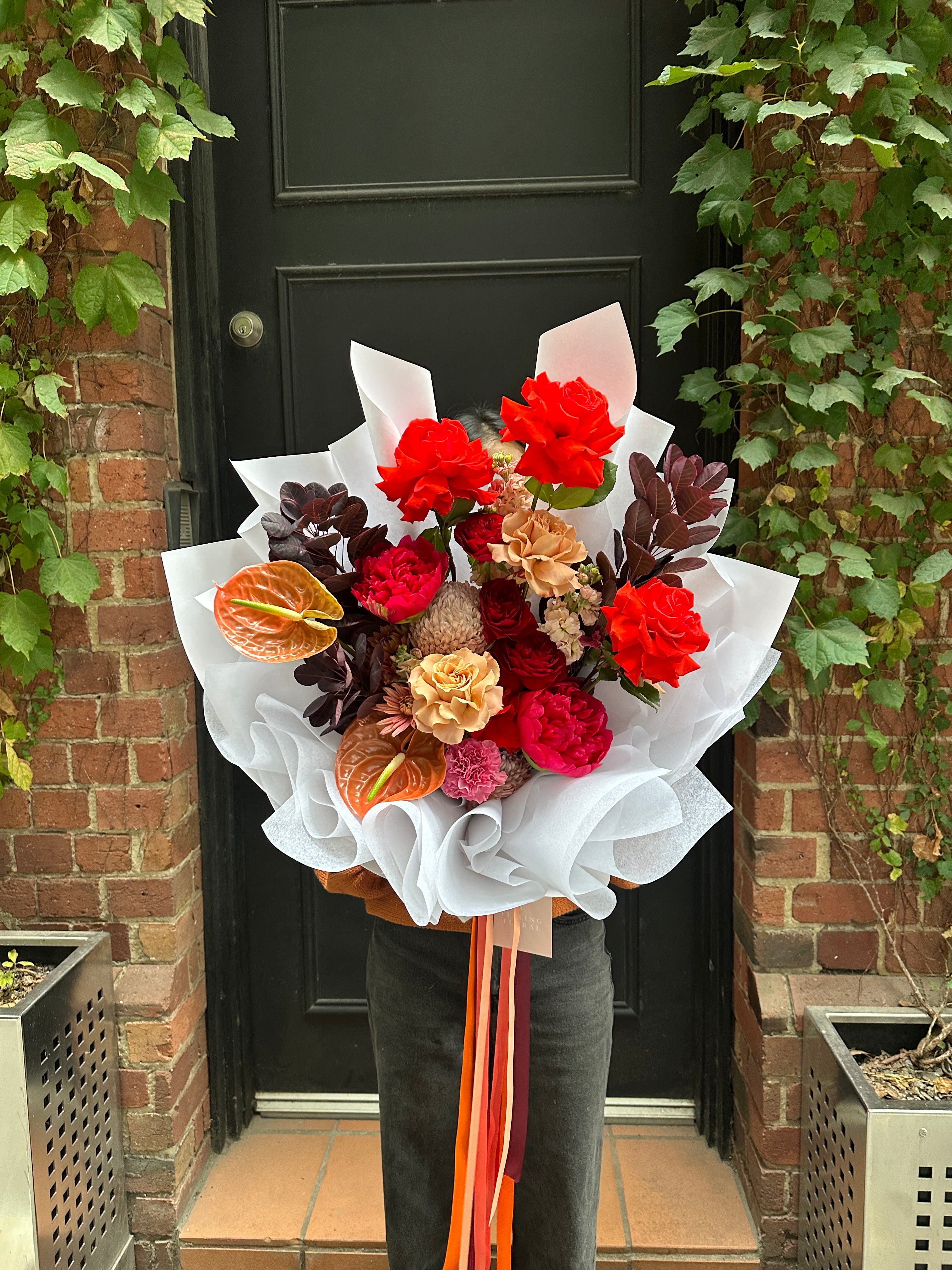 Please note - The images are used as inspiration and we will do our very best to capture the composition of this arrangement. There will be variations in the colours and placement of the flowers as it is dependant on limited market and seasonal availability. If you have specific requirements regarding flower selection, please email us directly.