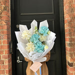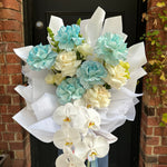 Introducing Blue Bliss Flowers, an ethereal symphony of nature's most serene shades, where the varying shades of blues seamlessly intertwine with pristine whites, creating a bouquet that embodies purity and tranquility. This bouquet is perfect for the arrival of a new baby boy or graduation! Orchids are included in Large upwards. Pictured - Large.