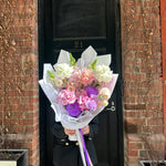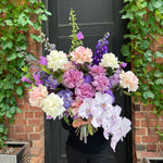 Indulge in the enchanting allure of Lavender Haze, where a carefully curated selection of premium purple blooms, complemented by shades of white and pink, come together in perfect harmony. The interplay of colors creates a visual symphony, evoking a sense of calmness and capturing attention with its captivating beauty. Orchids are included in Large upwards. 1st Picture Luxe. 2nd Pictured - Large
